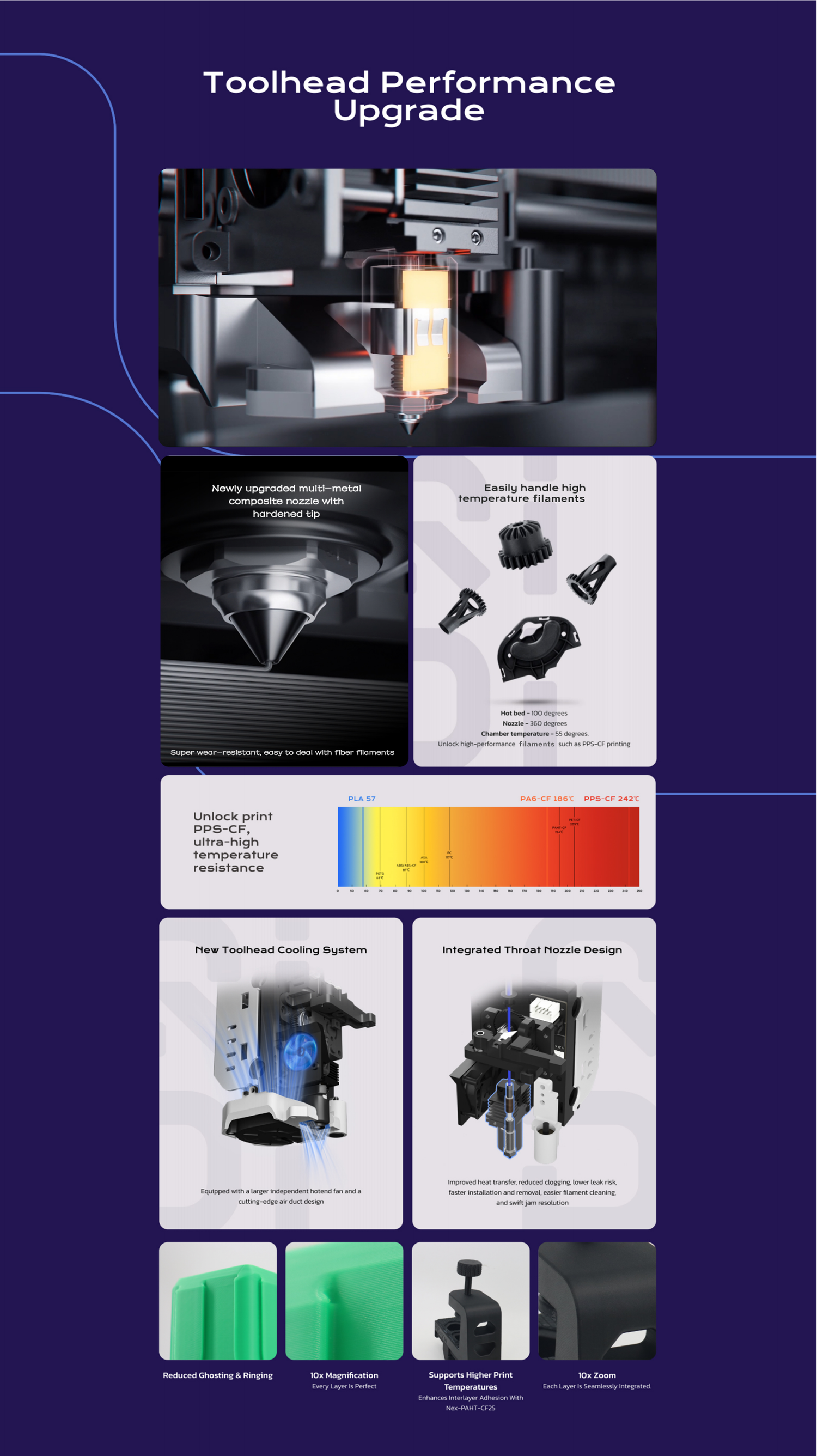 • Second-gen 80W bimetal hotend for advanced filament handling.